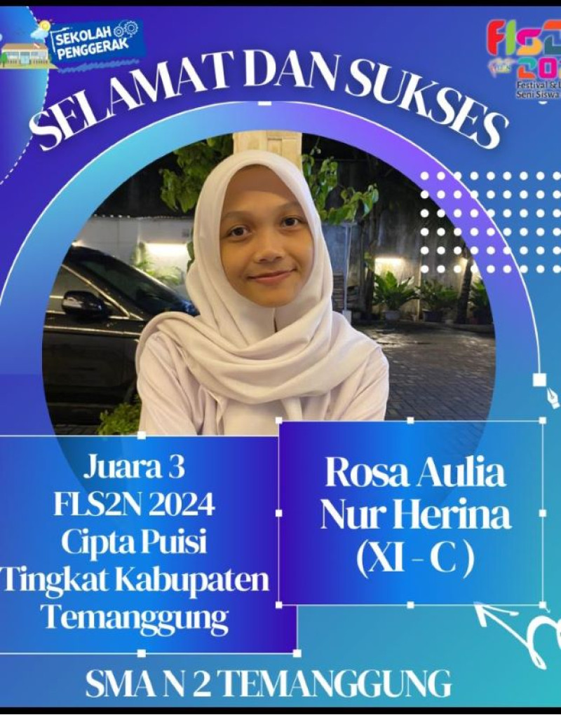 Selamat dan sukses kepada Rosa Aulia Nur Herina Kelas XI C SMA Negeri 2 Temanggung atas prestasinya sebagai Juara 3 FLS2N 2024 Bidang Cipta Puisi Tingkat Kabupaten Temanggung