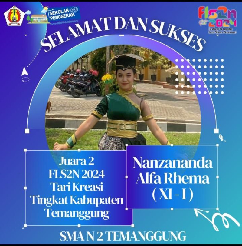 Selamat dan sukses kepada Destania Putri Wahyudi Kelas X E dan Nanzananda Alfa Rhema Kelas XI I SMA Negeri 2 Temanggung atas prestasinya sebagai Juara 2 FLS2N 2024 Bidang Tari Kreasi Tingkat Kabupaten Temanggung.
