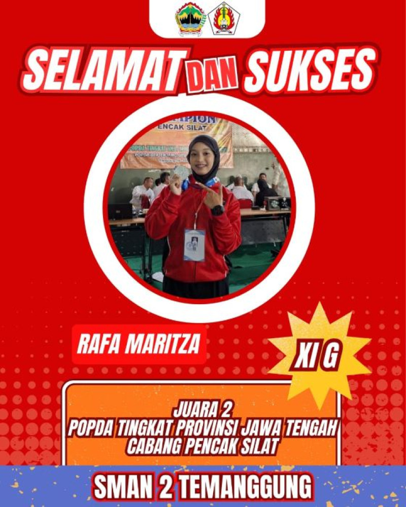 Selamat kepada Rafa Maritza Kelas XI G SMA Negeri 2 Temanggung yang telah meraih Juara 2 POPDA Tingkat Provinsi Jawa Tengah Cabang Pencak Silat Tahun 2025
