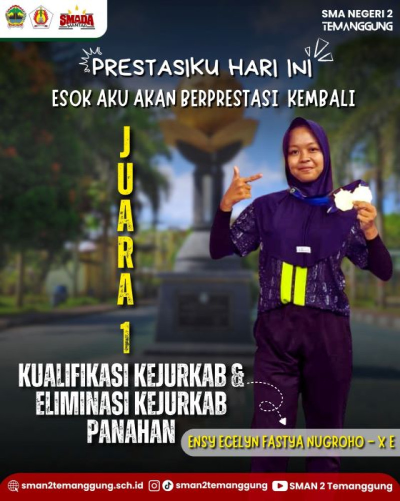 Selamat dan sukses kepada Ensy Ecelyn Fastya Nugroho, Kelas X E SMA Negeri 2 Temanggung yang berhasil meraih Juara 1 Kualifikasi Kejurkab dan Eliminasi Kejurkab Panahan Tahun 2025