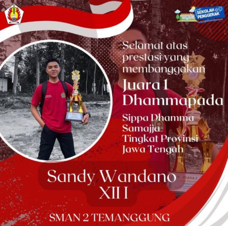 Selamat dan sukses kepada Sandy Wandano Kelas XII I SMA Negeri 2 Temanggung atas prestasinya sebagai Juara I Dhammapada Sippa Dhamma Samajja Tingkat Provinsi Jawa Tengah Tahun 2024.