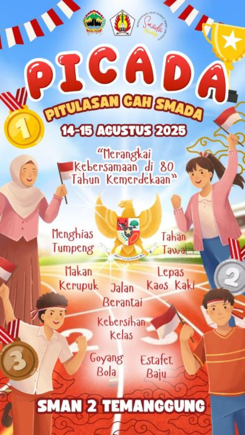Kamis, 14 Agustus 2025 s.d. Jumat, 15 Agustus 2025 SMA Negeri 2 Temanggung melaksanakan kegiatan PICADA atau PITULASAN CAH SMADA dalam rangka memperingati HUT-RI Ke 80. Kegiatan ini diikuti oleh semua warga SMA Negeri 2 Temanggung. PICADA kali ini mengangkat tema Merangkai Kebersamaan di 80 Tahun Kemerdekaan.