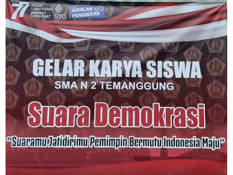 SelengkapnyaSenin, 5 September 2022 SMA Negeri 2 Temanggung menggelar pemilihan Ketua OSIS masa bakti 2022 - 2023 dengan sistem pemilihan umum. Tahapan kegiatan diawali dengan orasi visi dan misi dari masing-masing kandidat.Ada enam kandidat Ketua OSIS :1. Daffi Gavra Fernanda2. ...