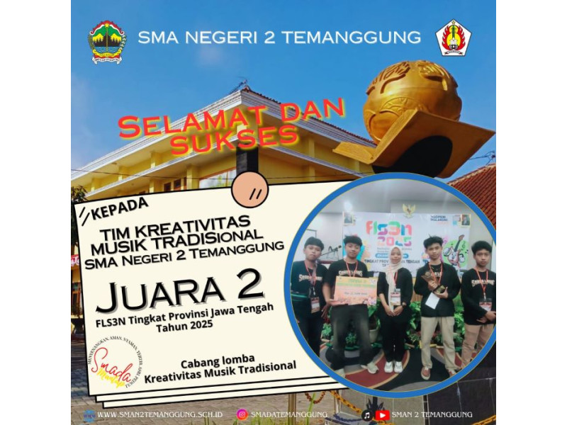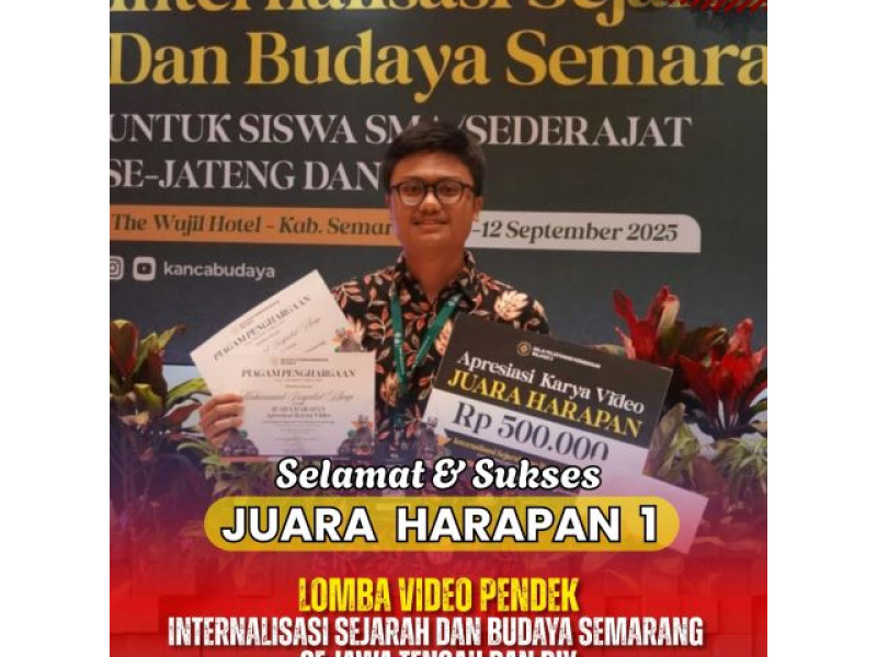 SelengkapnyaSelamat dan Sukses Kepada Irsyad Kelas XII SMA Negeri 2 Temanggung yang telah meraih Juara Harapan I Dalam Lomba Video Pendek Internalisasi Sejarah dan Budaya Semarang Se-Jawa Tengah dan DIY ...