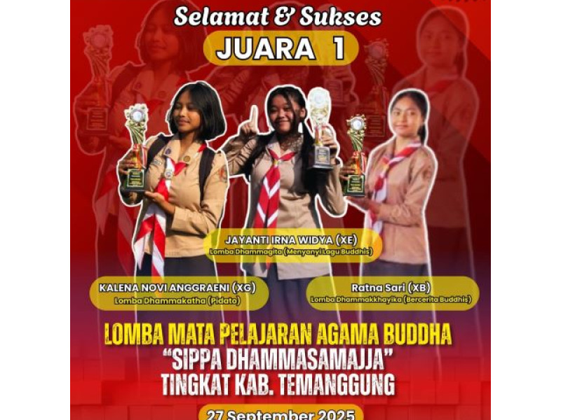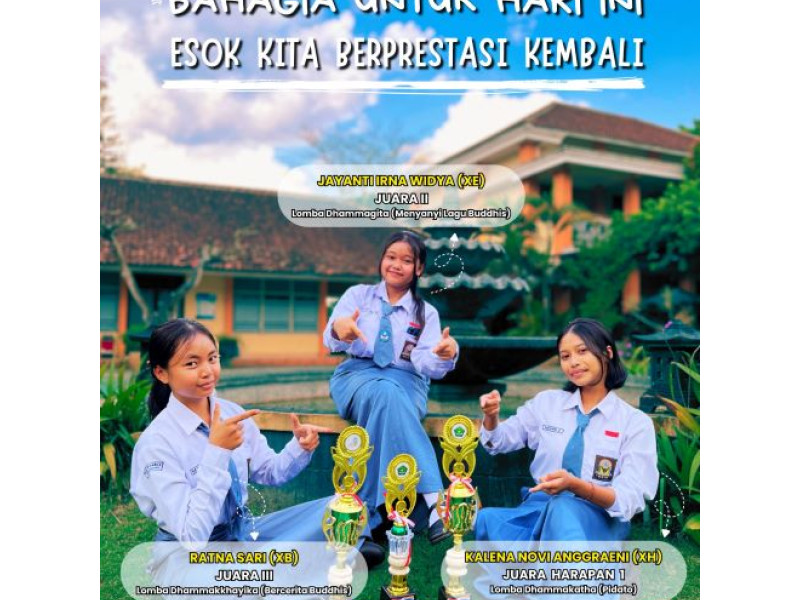 SelengkapnyaSelamat dan Sukses Kepada :1. Kalena Novi Anggraeni, Kelas X G, Meraih Juara I Lomba Dhammakatha (Pidato).2. Jayanti Irna Widya, Kelas X E, Meraih Juara I Lomba Dhammagita (Menyanyi Lagu Budhis).3. Ratna Sari, Kelas X B, Meraih Juara I Lomba...