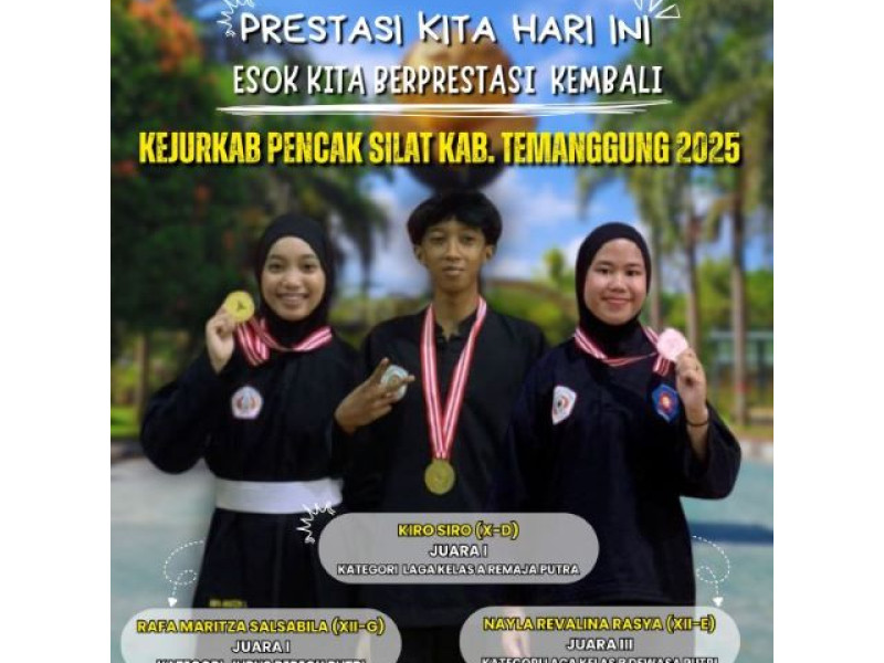 Selamat dan Sukses kepada :1. Kiro Siro, Kelas X D, Juara I Kategori Laga Kelas A Remaja Putra.2. Rafa Maritza Salsabila, Kelas XII G, Juara I Kategori Jurus Beregu Putri.3. Nayla Revalina Rasya, Kelas XII E, Juara III Kategori Laga...