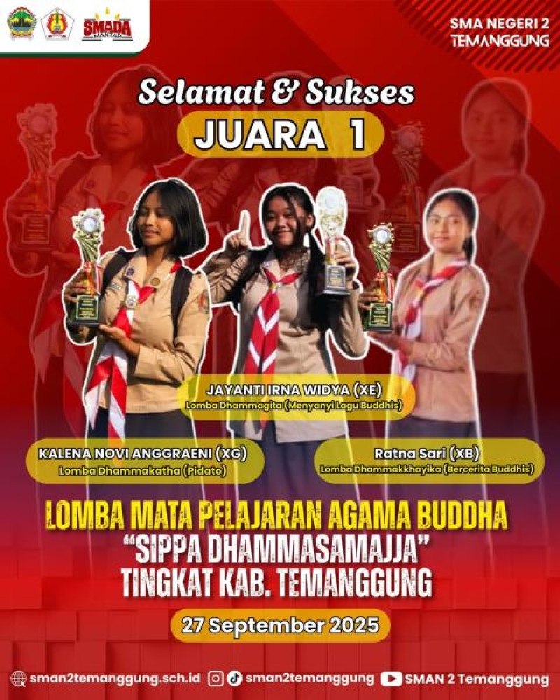 1. Kalena Novi Anggraeni, Kelas X G, Meraih Juara I Lomba Dhammakatha (Pidato).